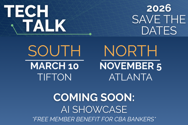 Innovation continues to be top of mind for Georgia’s community bankers in 2026 and CBA announces the dates for the popular Tech Talk programs: