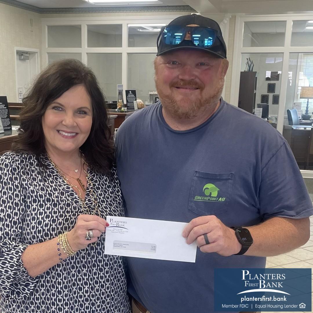 ![]() Planters First Bank, Hawkinsville, sponsored the Mount Hope Lodge #9 First Responders Appreciation Dinner. Pictured: Bobbie Clemons with Kyle Goss from Mount Hope #9.