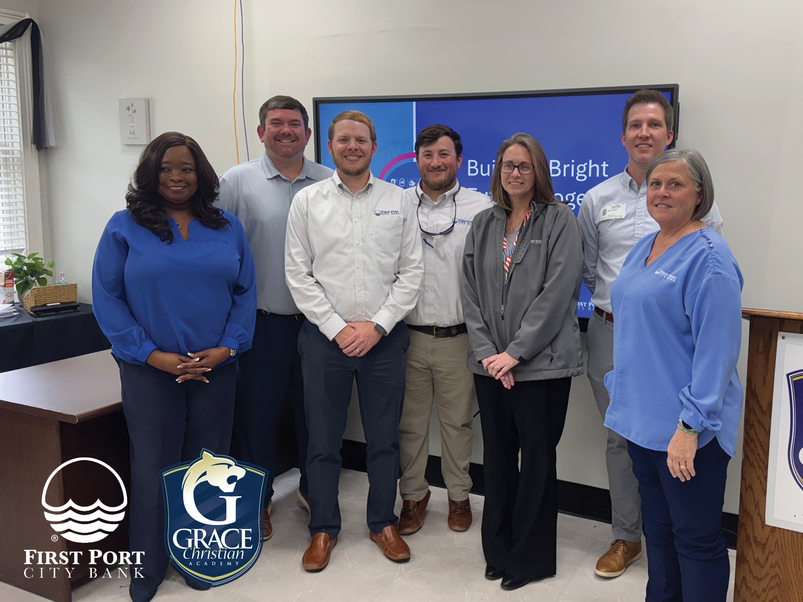 Employees from First Port City Bank, Bainbridge, delivered a two-day financial education presentation to middle and high school students at Grace Christian.