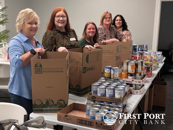 Employees from First Port City Bank, Bainbridge, hosted a bake sale and the proceeds were used to donate 20 Thanksgiving meal boxes to The Salvation Army of Bainbridge, for families in need. In addition, the staff donated 5 meal boxes to Gentiva Hospice who will share them with families in the community.