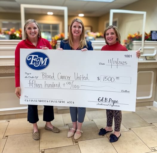 F&M Bank, Washington, donated $3,000 to Blood Cancer United. F&M Bank matched $1,500 of the donations made by our generous community.
