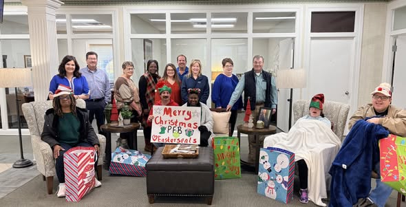 Clients of Easter Seals visited Planters First Bank, Hawkinsville, where the bank team shared Christmas gifts with each guest. The clients gave the bank handmade Christmas trees and a beautiful poster for the lobby.