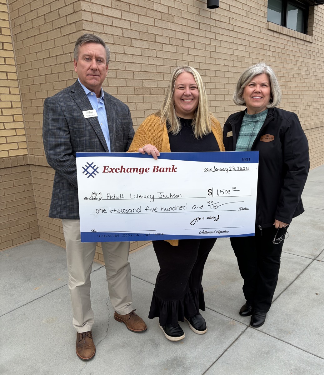 Exchange Bank, Braselton, presented a $1,500 donation to Adult Literacy Jackson in support of the organization’s mission to strengthen individuals and communities through adult literacy. Pictured are Sandee George, Executive Director of Adult Literacy Jackson; Tripp Conner, Senior Vice President and Market President of Exchange Bank; and Schaun Crane, Vice President and Commercial Banker of Exchange Bank.