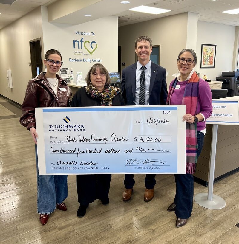 Touchmark National Bank, Alpharetta, recently with a donation to North Fulton Community Charities. The organization offers assistance to those in need including hunger and homelessness prevention, workforce development, and financial literacy.