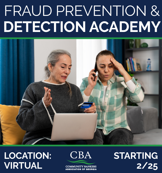 Fraud continues to evolve at an unprecedented pace, challenging community banks to stay informed, vigilant, and proactive. To help bankers meet this challenge head-on, CBA is proud to offer the Fraud Prevention and Detection Academy — a four-part Professional Development Series designed to deliver timely insights and practical strategies for today’s rapidly changing fraud landscape.